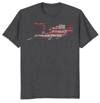 Cool Scuba Diving Dad Word Art Tshirt This scuba tee is comprised of fun quotes that make up an outline of a diver. Word art on the tee includes: COOL SCUBA DIVING DAD, Rocks a Westuit, Dive Time is Happy Time, My kid gave me this, Meet me underwater, Sharks schmark, His happy place, He can breathe underwater, Keep diving, Love the ocean and Certified fun. Great unique present for Father's Day, his birthday, Christmas or really any holiday. Show your Dad and the world you love him. Available in 5 colors and many sizes. Get this Diving Dad shirt here.