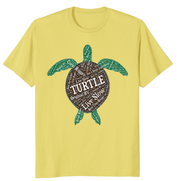 Sea Turtle Wordart Tshirt Show your love of sea turtles with this fun shirt. The funny sayings on this sea turtle shirt include Turtle, Live Slow, Coral Hugger, Not A Soup Ingredient, What's The Hurry, Original RV, Best Tiny House, Save The Turtle, Swim Slow Travel Far and Ocean Home. |
